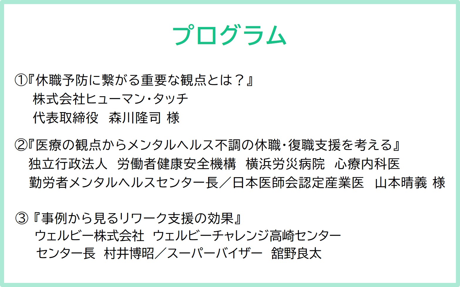 「ウェルビーリワークフォーラム2025」では、企業内におけるメンタルヘルス対策・リワーク支援に向けた不安や疑問にこたえ、企業と支援者が一体となって一人ひとりの社員がより働きやすい職場環境を共に考えていきます。