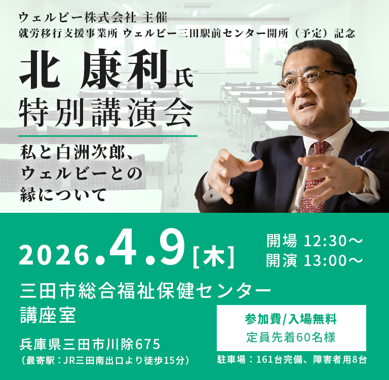本講演は、ウェルビー三田駅前センターの5月開所(予定)を記念し、北康利氏をお招きして「私と白洲次郎、ウェルビーとの縁について」ご講演いただきます。